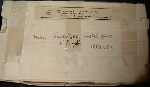 The actual box from George Wright's studio in Pasadena, which brought the treble end of the Robert Morton Tibia to the Wothing WurliTzer.